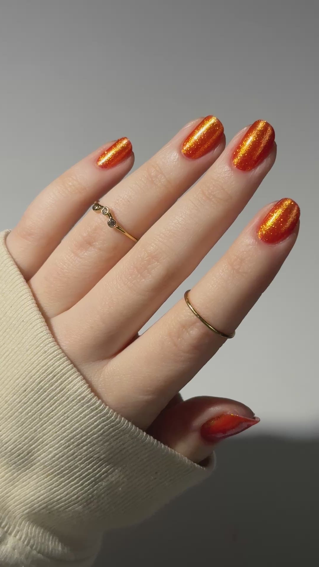 This polish has an orange jelly base with gold, green, and blue shifting shimmer.