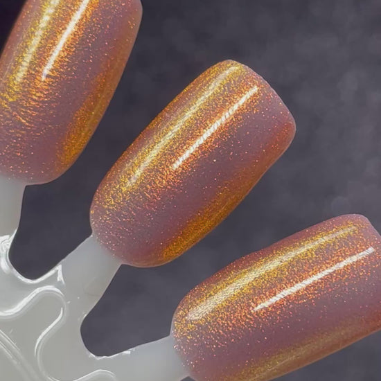 A sheer jelly brown base with strong orange and gold shifting shimmer.