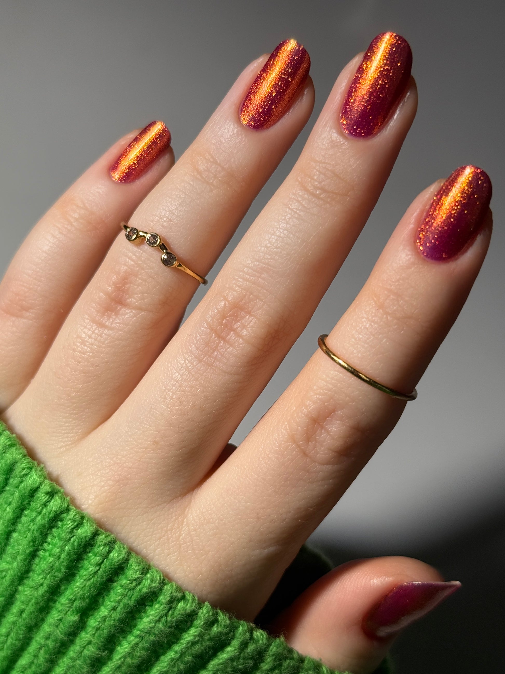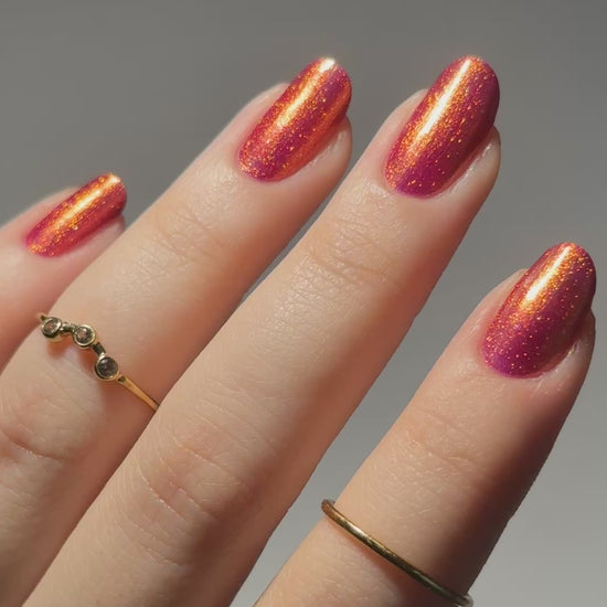 This polish has a cranberry pink base and strong gold shimmer. The combination of the base and shimmer can cause the base to appear slightly orange in some lighting conditions.
