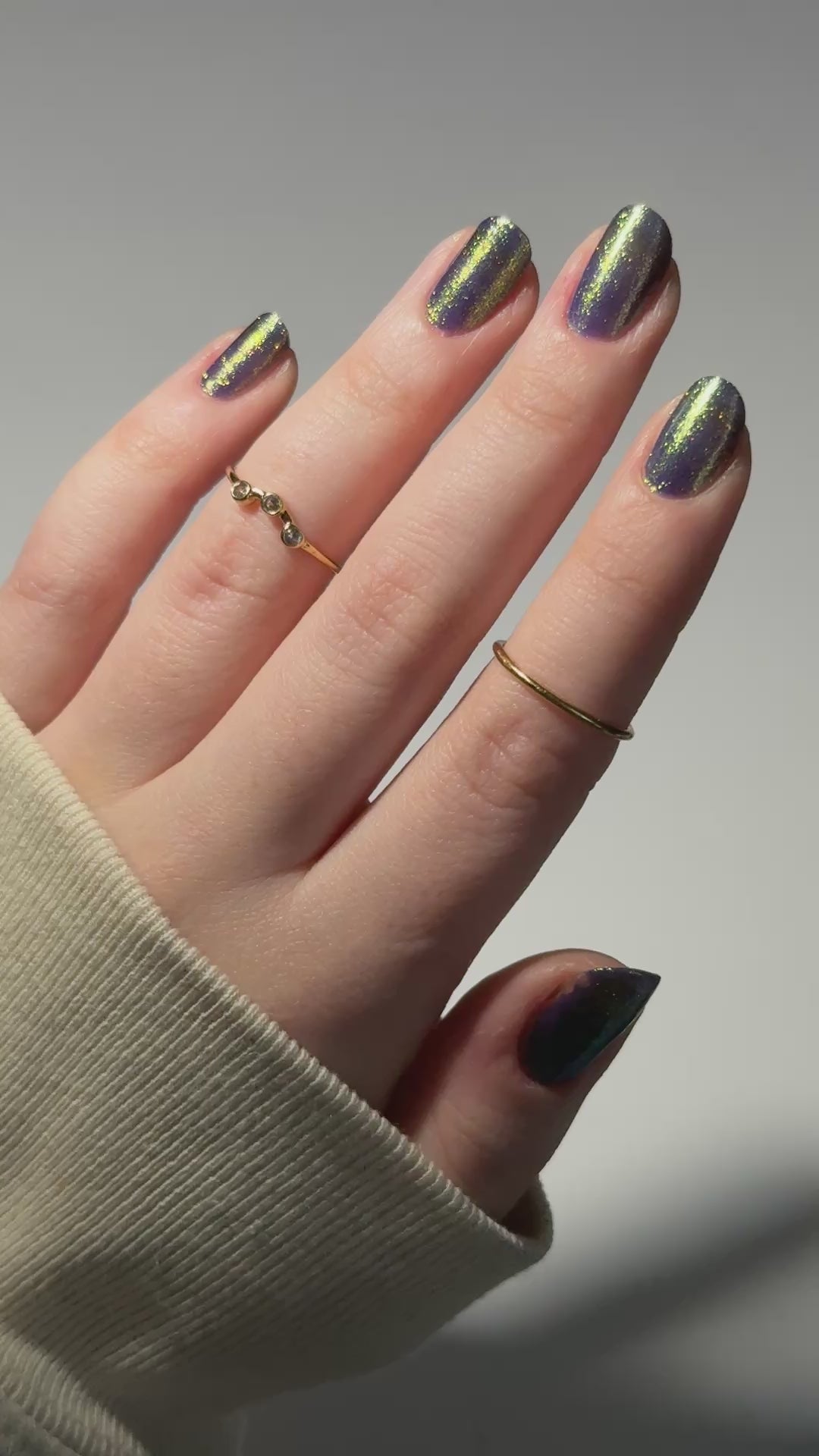 This polish has a cool purple (blurple) jelly base with gold, green, and blue shifting shimmer.