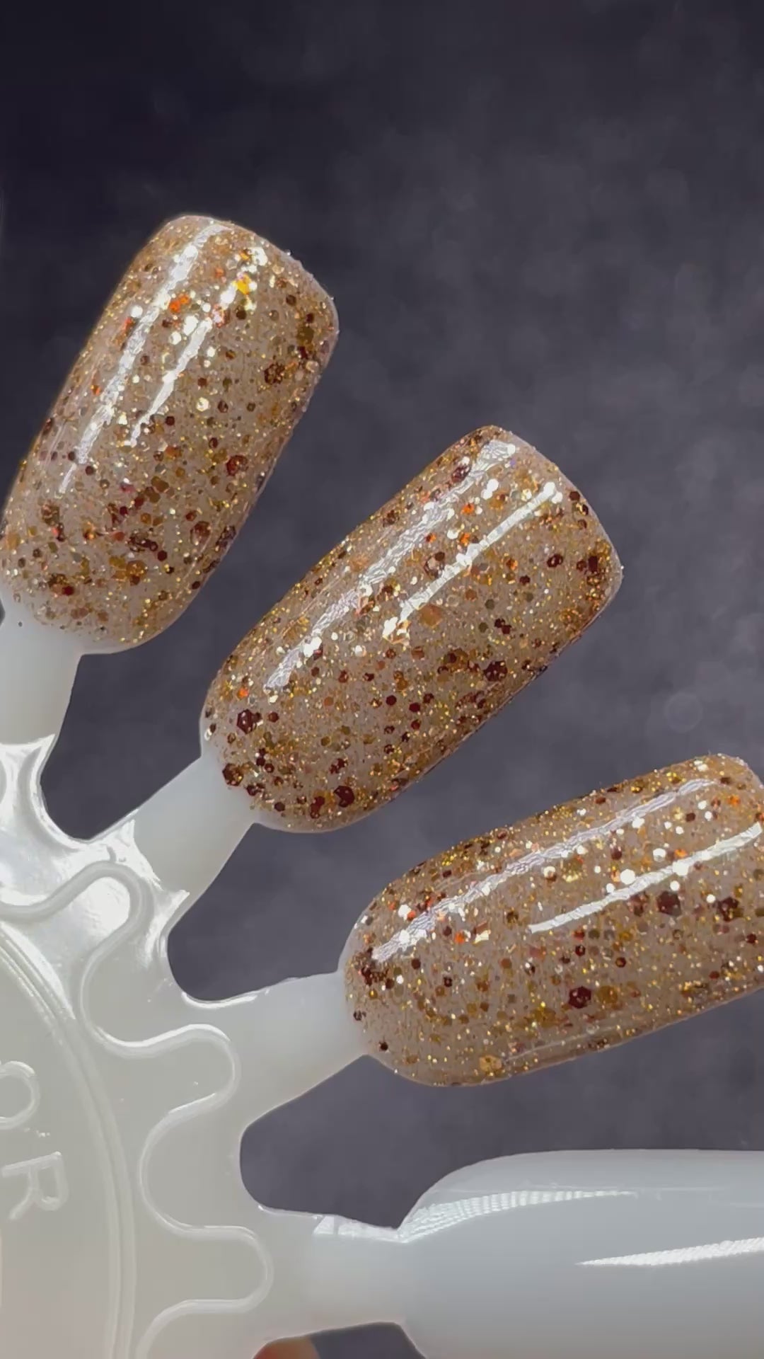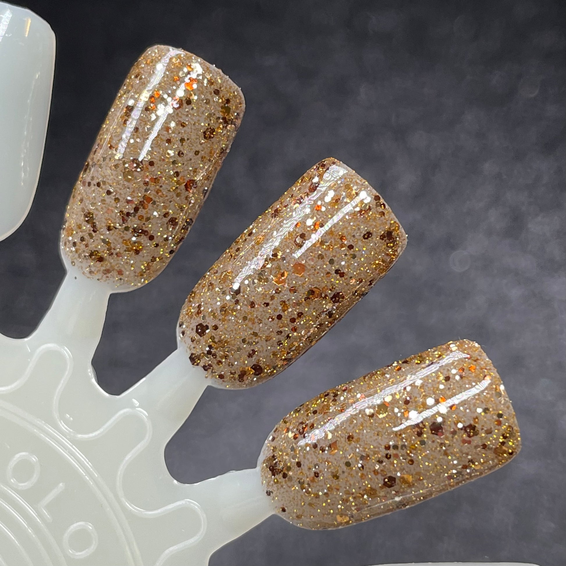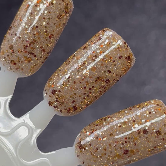 Sheer brown jelly with assorted gold and brown glitters with gold reflective glitters that come alive under bright lights.