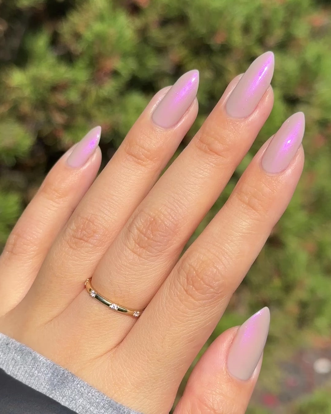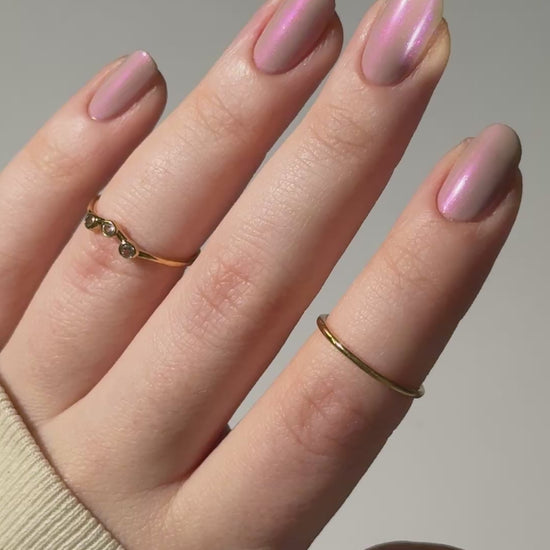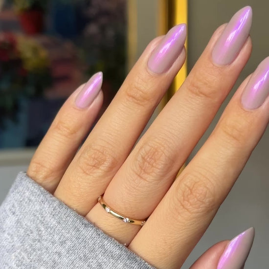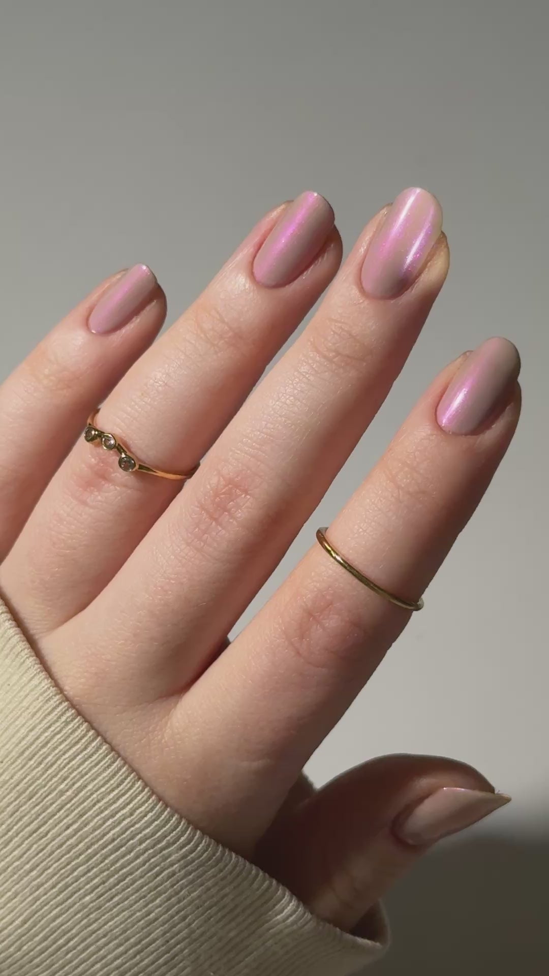 This polish has a sheer light taupe base with with purple, pink, orange shifting shimmer. This one is formulated to be slightly sheer to allow the delicate shimmer to take center stage.